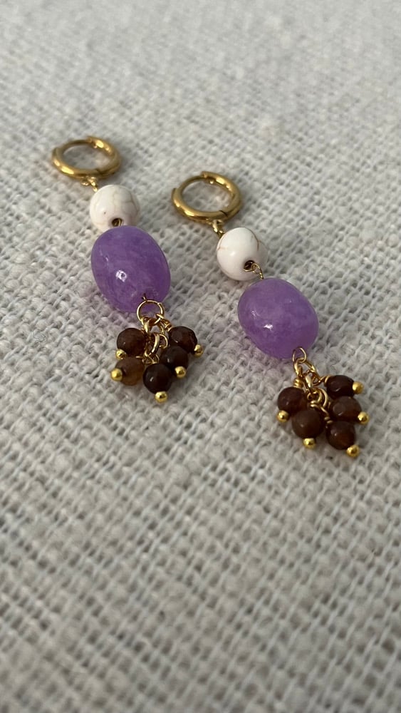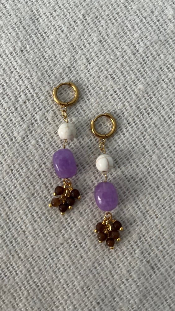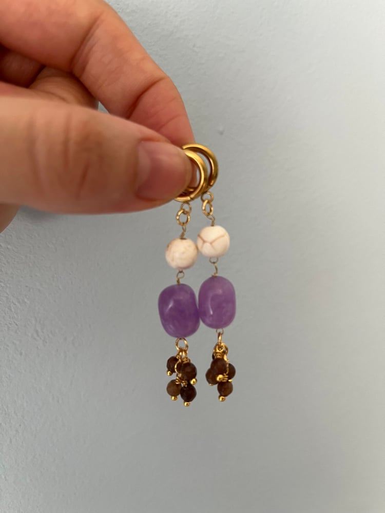 Aros dorados con colgante de tres piedras naturales: howlita blanca veteada, amatista central y racimo final en tonos marrón oscuro de cuarzo ahumado. El diseño mezcla formas orgánicas con un aire vertical.