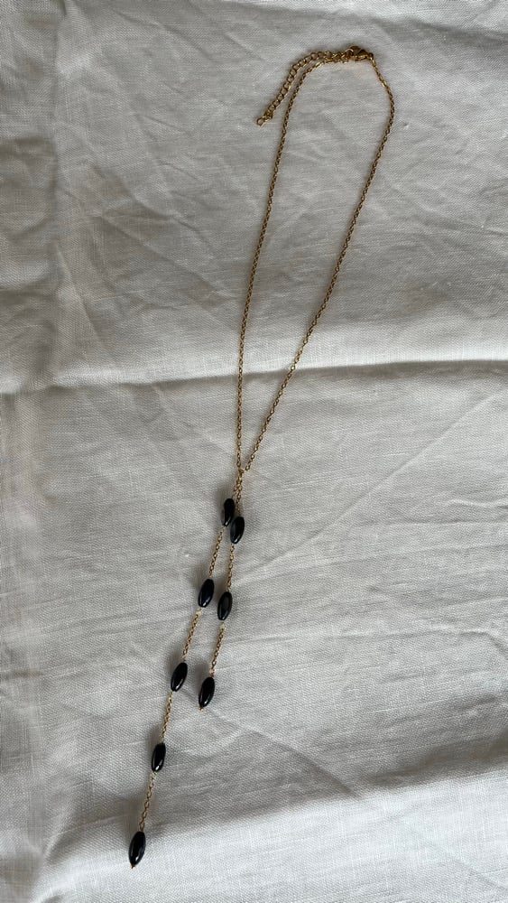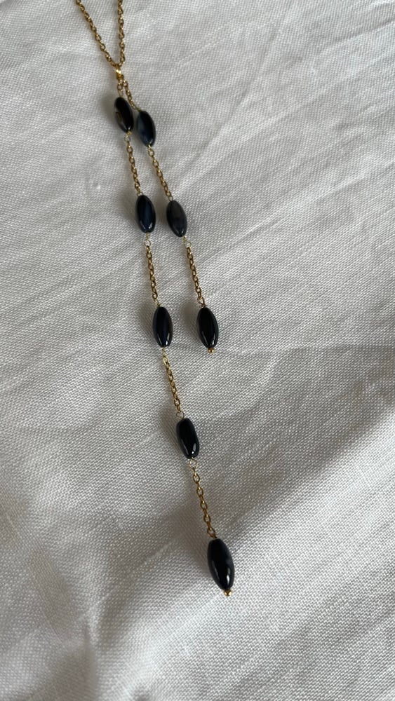 Collar compuesto por una sencilla y elegante cadena de acero inoxidable con baño en oro y piedras de cuarzo azul.
