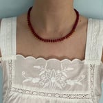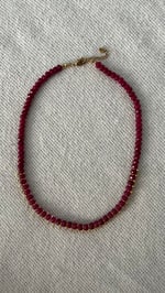 Collar corto con cuentas facetadas en burdeos y malva, con pequeñas gotas doradas en el borde inferior. El diseño es simétrico, con un ritmo visual claro y un acabado brillante.