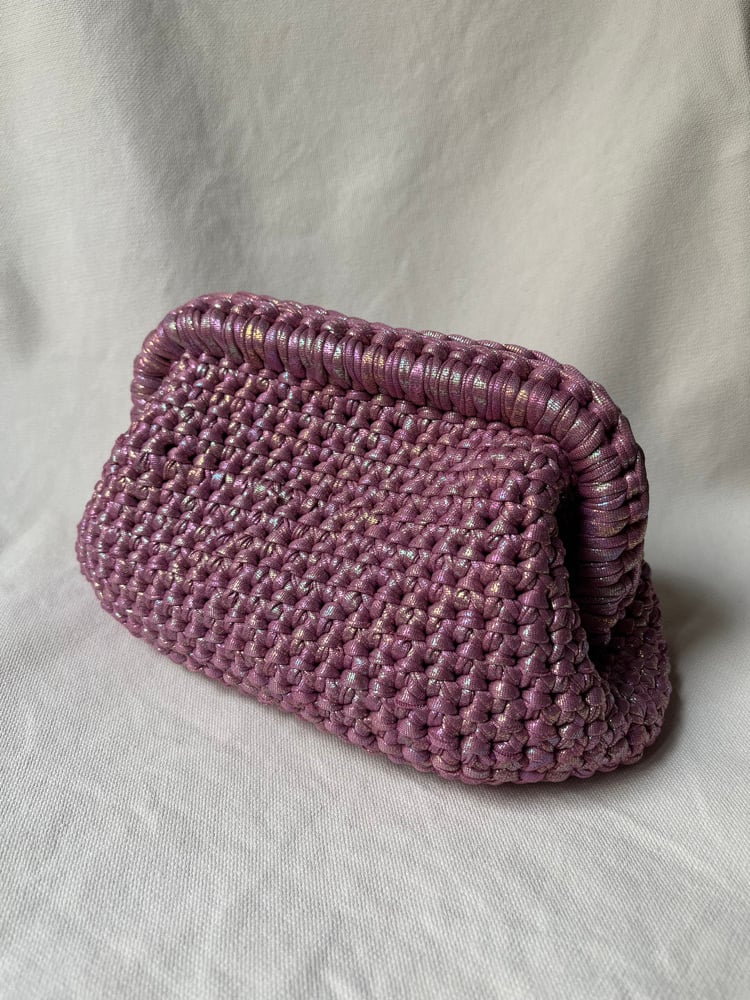 Bolso de mano hecho a ganchillo en trapillo malva metálico. Tiene cuerpo, textura y estructura, con un cierre superior tipo boquilla que mantiene la forma abierta.